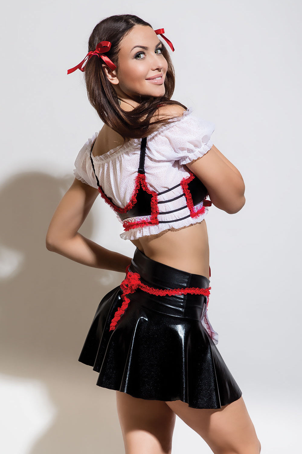 Atemberaubendes Outfit Waitress Heidi von Hamana Dessous, bestehend aus Rock Schürze, Top, Weste und einem String-Tanga. Für den Stoff wurde schwarzes Wetlook-Material und weißes Netz-Material verwendet. Die schwarz/rote West hat verstellbare Träger und eine Schnürung auf der Vorderseite. Achtung nur bei Größe S/M - Der Rock fällt klein aus und entspricht einer Größe S. Der Artikel ist in einer Hochglanzbox verpackt. Pflegehinweis : 30Grad Handwäsche Farbe : schwarz/weiß Material : 94% Polyester / 6% Elasthan erhältliche Größen : S/M, L/XL | Größentabelle