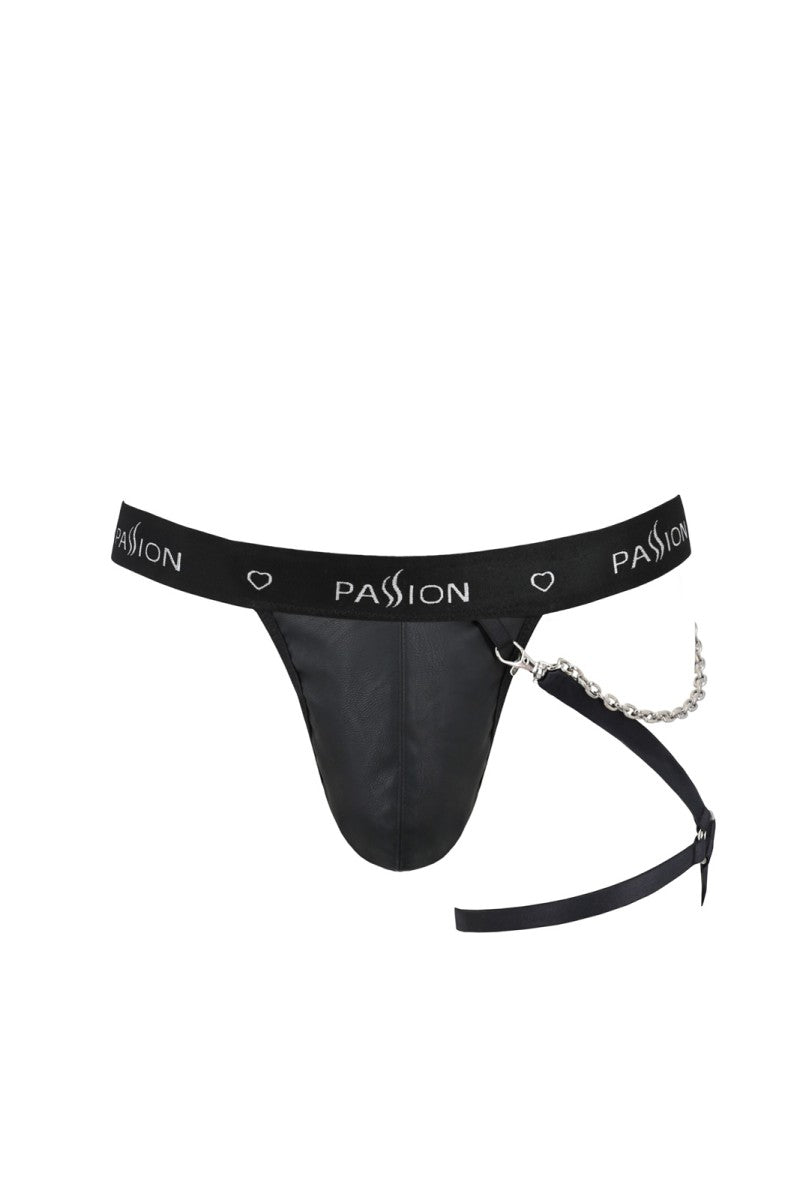 Herren String gefertigt aus mattem Kunstleder und breitem Gummibund mit Passion Logo. Abnehmbarer Beinharnes mit Metallkette. Der Artikel ist in einer... Read more Read more