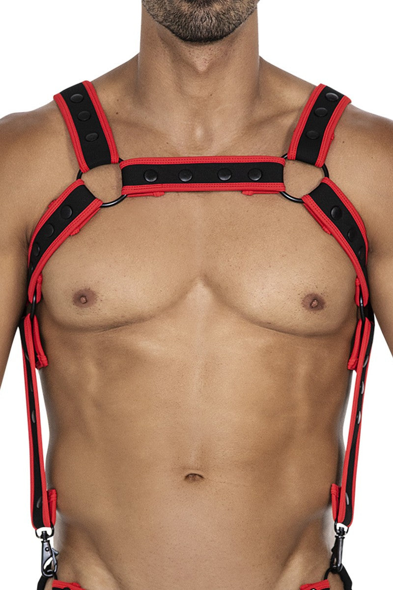 Herren-Geschirr aus weichen Neopren und schwarzen Metallringen. Die Größe ist durch Druckknöpfe regulierbar. Durch zwei Karabinerhaken, kann der Harness an ein entsprechendes Unterteil verbunden werden, somit kann er auf zwei verschiede Art und Weise getragen werden. Farbe : schwarz/rotMaterial : 100% Neopren, Metall